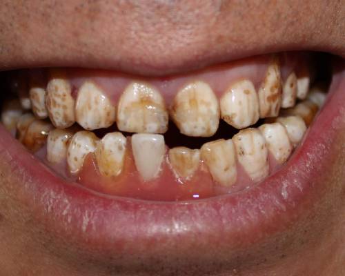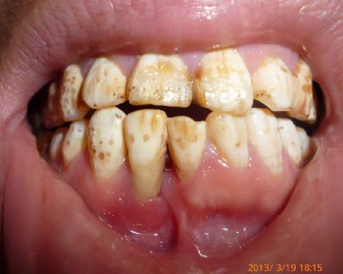本人居住山西运城,属于黄土高原的汾河南塬,当地水质不好,含氟很高,所以自小喝这种水长大,牙齿质量可想而知:黄、斑、脆、歪,是典型的"氟斑牙"的特征。(见下图)