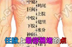 这是14经脉上最容易堵的点专题的文章的倒数第二篇。上周我们写了大肠经上最容易的堵的点,均位于肩关节附近,虽然在经络上,但不在穴位上。今天,我们继续探讨任脉上最容易堵的点,先说结论经,根据我多年临床的经验,任脉上最容易堵的点,就在腹部上的上、中、下三脘穴,而以中脘为最堵点。老规矩,先上经络图: